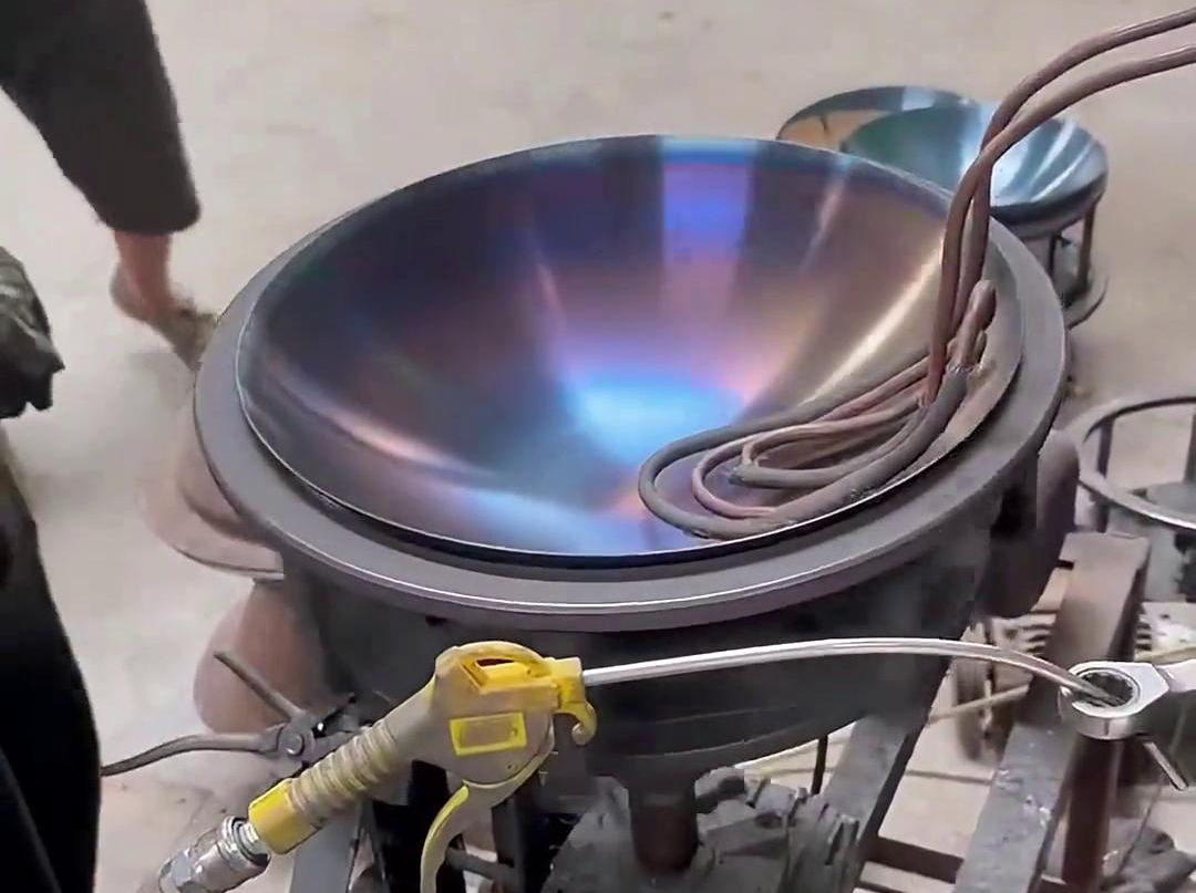 高頻感應(yīng)加熱設(shè)備在鐵鍋烤藍(lán)工藝中的應(yīng)用,是一種高效且環(huán)保的熱處理方法??舅{(lán)是指在鐵鍋表面形成一層藍(lán)黑色的氧化膜,這層氧化膜可以提高鐵鍋的耐腐蝕性,同時賦予其獨特的美觀外觀。傳統(tǒng)的烤藍(lán)方法可能涉及化學(xué)處理或明火加熱,而高頻感應(yīng)加熱則提供了一種更為先進(jìn)和控制精準(zhǔn)的解決方案。